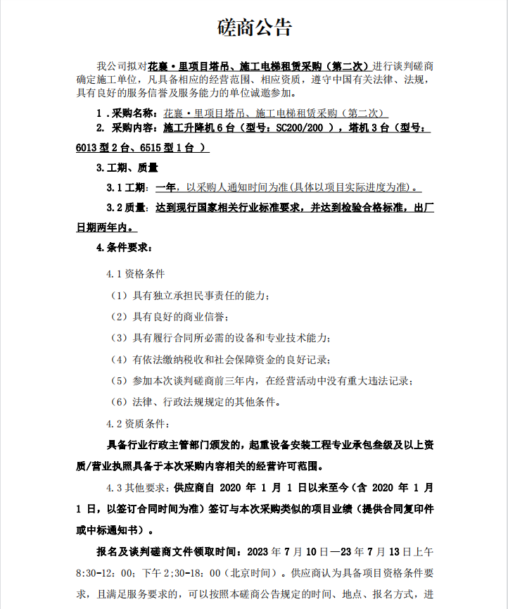 花襄·里項目塔吊、施工電梯租賃采購(第二次)談判磋商公告